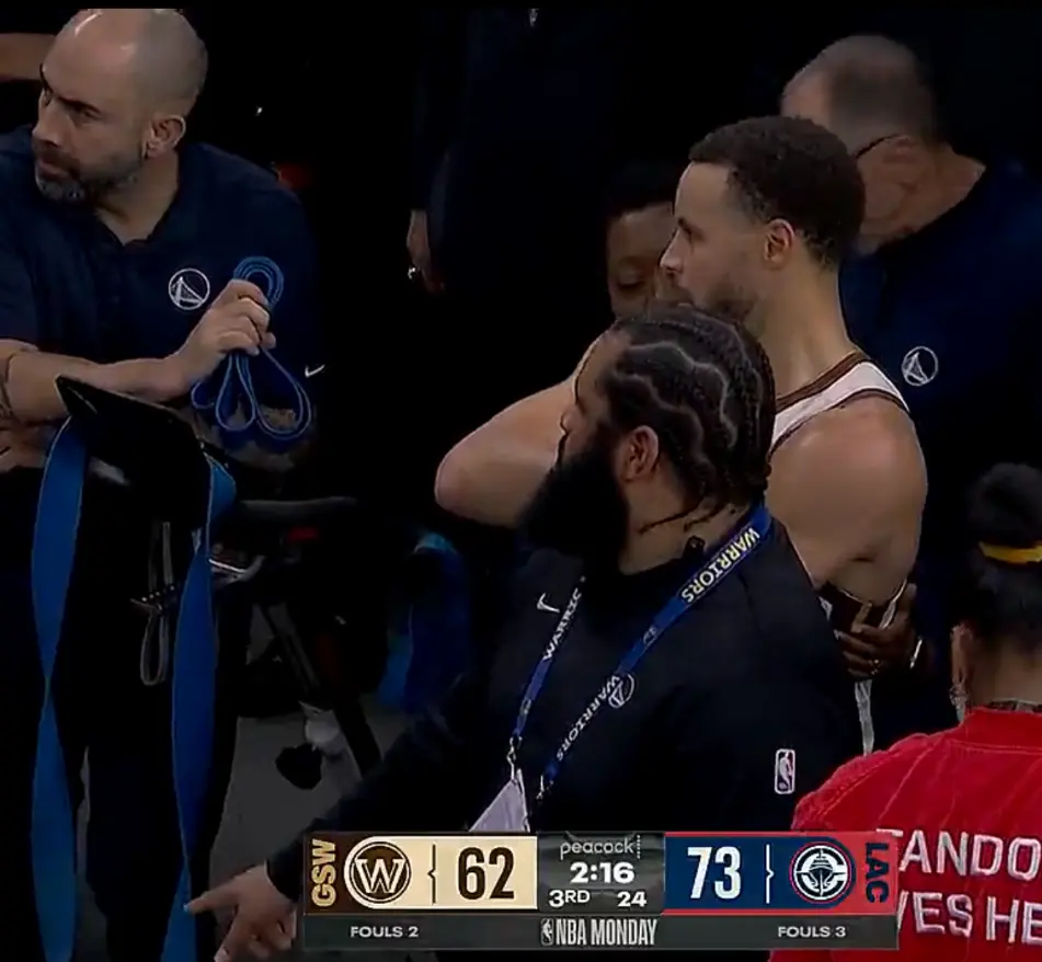 库里第三节下场时在球员通道拉伸背部的位置,库里疑似背部的肌肉有些不适,但库里还是决定在末节先登场带队追分。