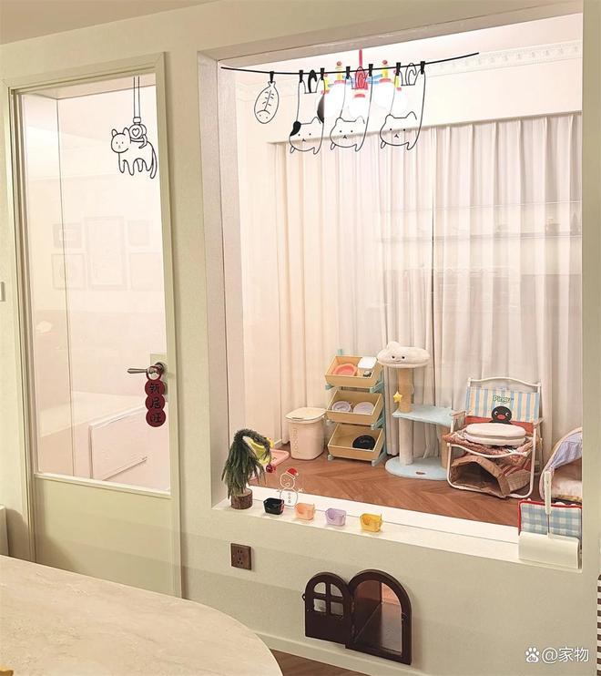 装修好后的猫房,不仅保留了原本的两扇大落地窗,还在隔断处用玻璃门窗代替,可以随时观察到里面猫咪的生活状态,而底部的小门洞白天都是保持打开的,方便猫咪自由进出,而晚上的时候也能让它们在里面安生睡觉,避免拆家跑酷,可以说是一举多得了。