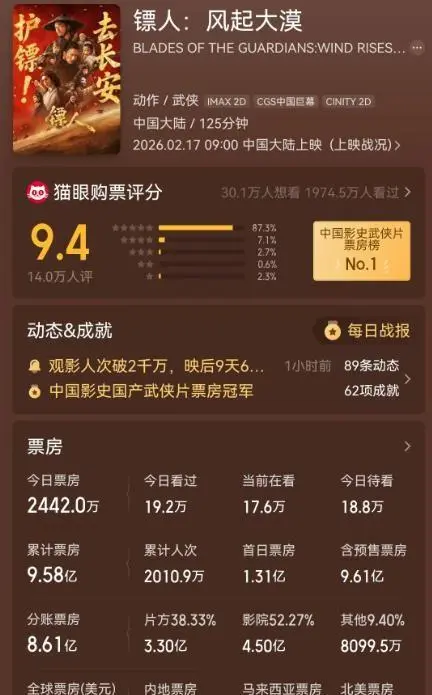 今年春节档的热气还没散尽,《飞驰人生3》还在影院里甩尾漂移,《惊蛰无声》和《镖人》却悄悄摸到了10亿门槛边上——停住了。尤其《镖人》,豆瓣7.8、猫眼9.3,打戏一帧没偷懒,沙漠飞沙、刀光泼雪全是实拍,连武指都夸“十年没见这么较真的武侠片”。可它就卡在13亿,离回本线差着两亿多,宣发一算账,连补拍那1个亿的窟窿都填不满。