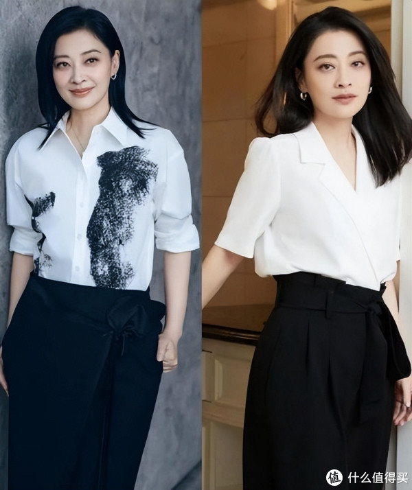 比如白衬衫,看起来简单大方,比穿t恤显得优雅多了。大家都知道,衬衫是中年女性的万能单品,上班通勤可以穿,日常搭配也可以穿,梅婷常搭配黑色阔腿裤在下半身,既干练又优雅,如果害怕白衬衫穿在身上太沉闷和严肃,可以解开领口,露出脖颈更显气质哦。