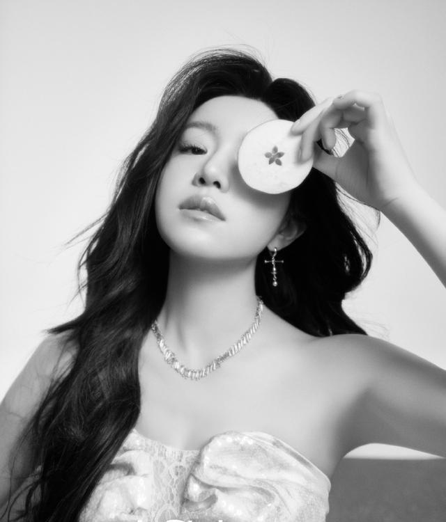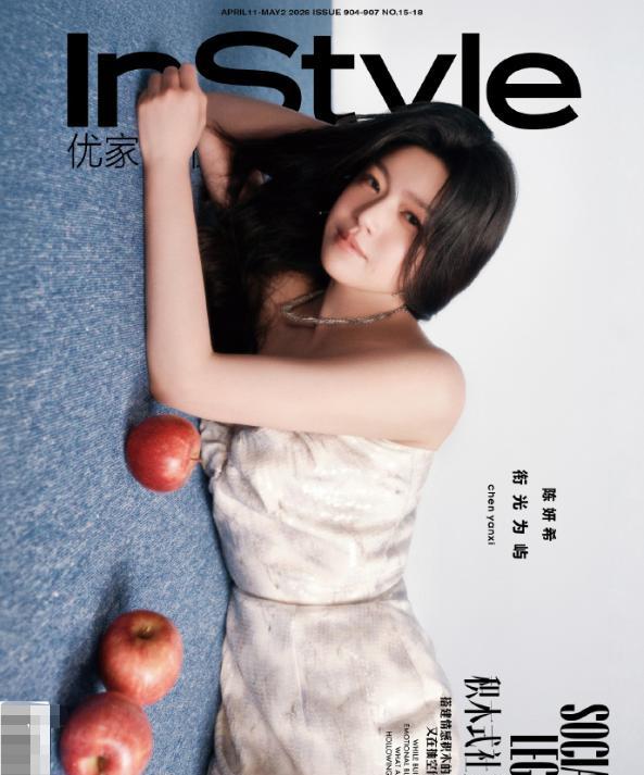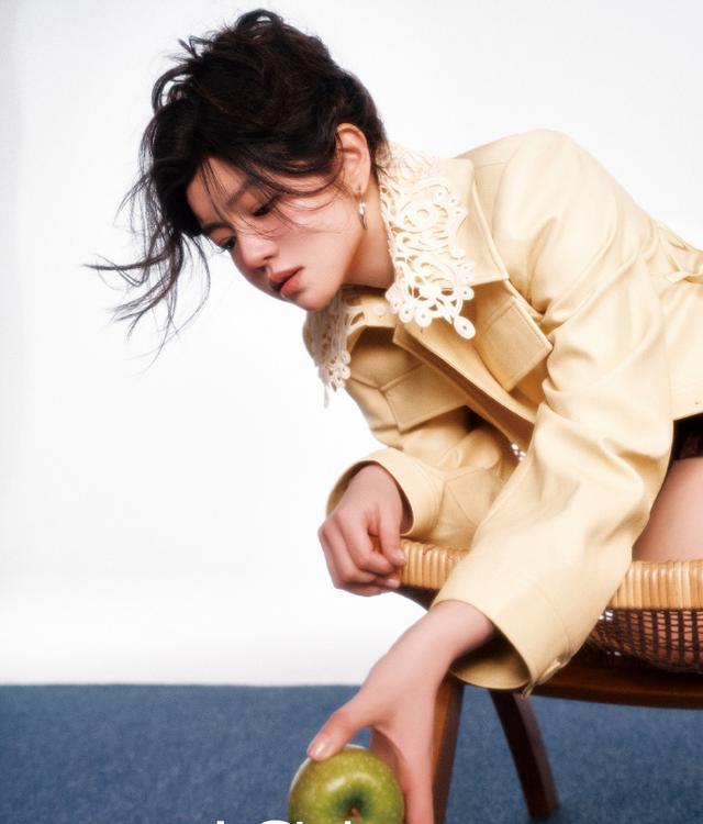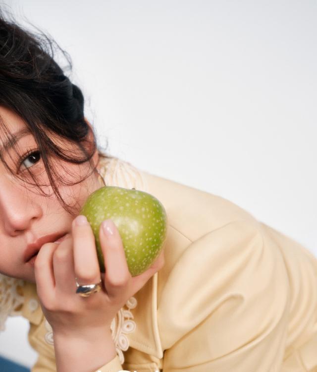 画面中的她身着缎面抹胸裙,慵懒倚在蓝色背景上,手抚长发,苹果点缀其间,清透裸妆衬出标志性的柔和眉眼,婴儿肥褪去后更添精致,梨涡浅笑间,是沈佳宜的清甜与高月香的坚韧的融合。