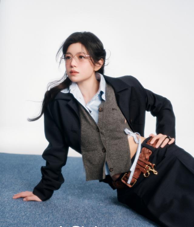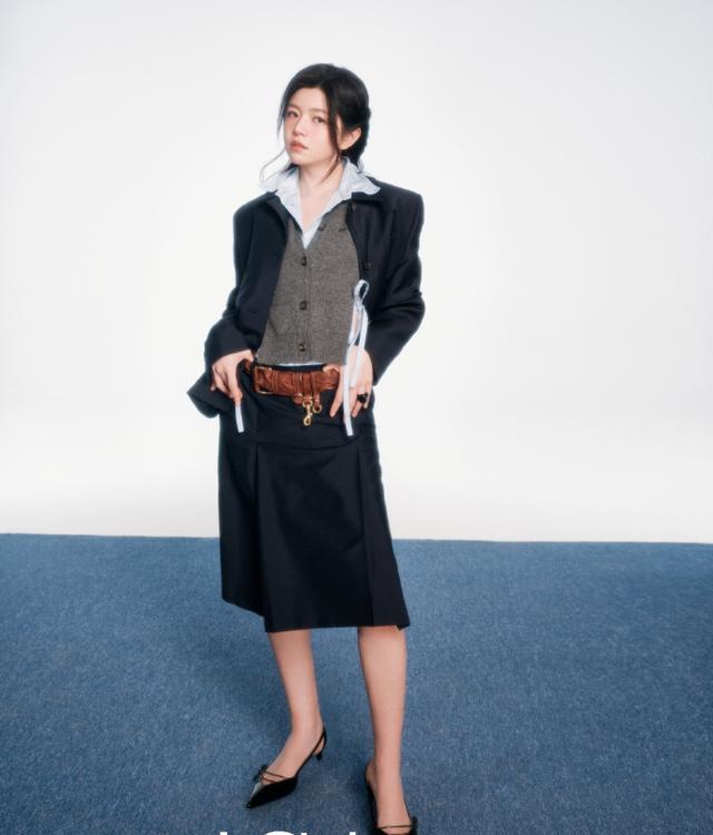 她换上了黑西装叠穿马甲与白衬衫,搭配高腰半裙,利落又复古。陈妍希或站姿挺拔,或单手叉腰,眼神从温柔转向锐利,动作舒展有力,将职场女性的飒爽与干练演绎得淋漓尽致。这套穿搭打破了大众对她 “甜妹” 的固有印象,呼应着《狙击蝴蝶》中她饰演的独立女性角色,用穿搭完成了戏里戏外的角色共鸣。