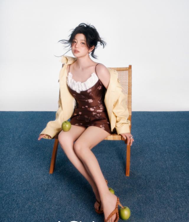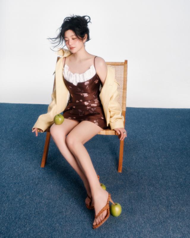 她穿着黄外套内搭亮片吊带裙,慵懒坐于藤椅,青苹果置于膝头,卷发凌乱却灵动,表情从明媚到沉静,动作松弛自然。陈妍希的这套穿搭既凸显了腰腹的紧致线条,又展现了她的少女感,打破了年龄的桎梏,呼应着 #陈妍希 42 岁状态 #的全网好评,证明了岁月从不败美人。