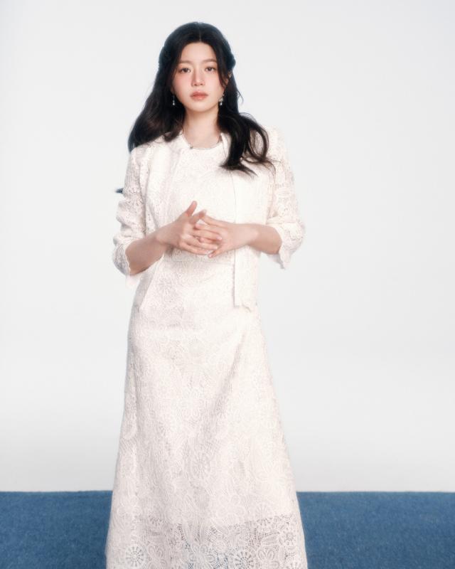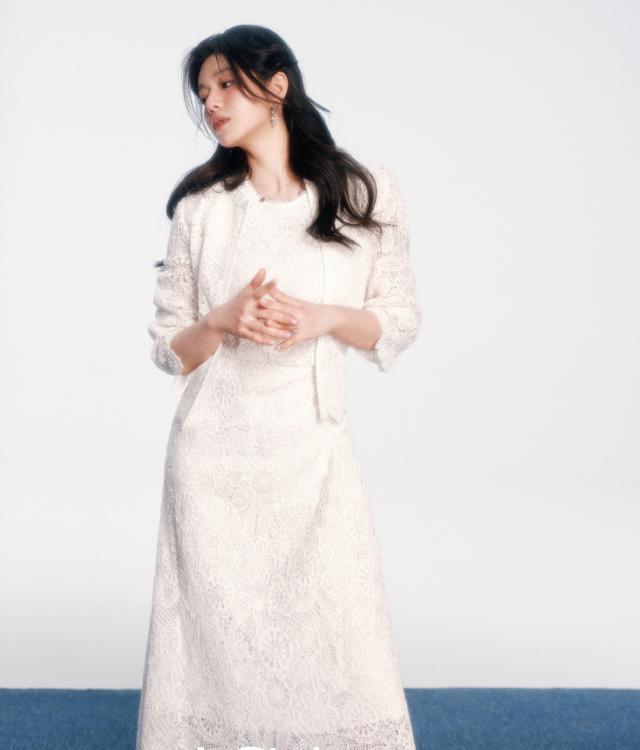陈妍希双手交叠,腕表点缀手腕,眼神坚定望向镜头,身材曲线玲珑,妆容精致,尽显成熟女性的魅力;白蕾丝套装中,她或站姿温婉,或双手交握,动作优雅,表情从容,将东方女性的温婉与大气演绎到极致。