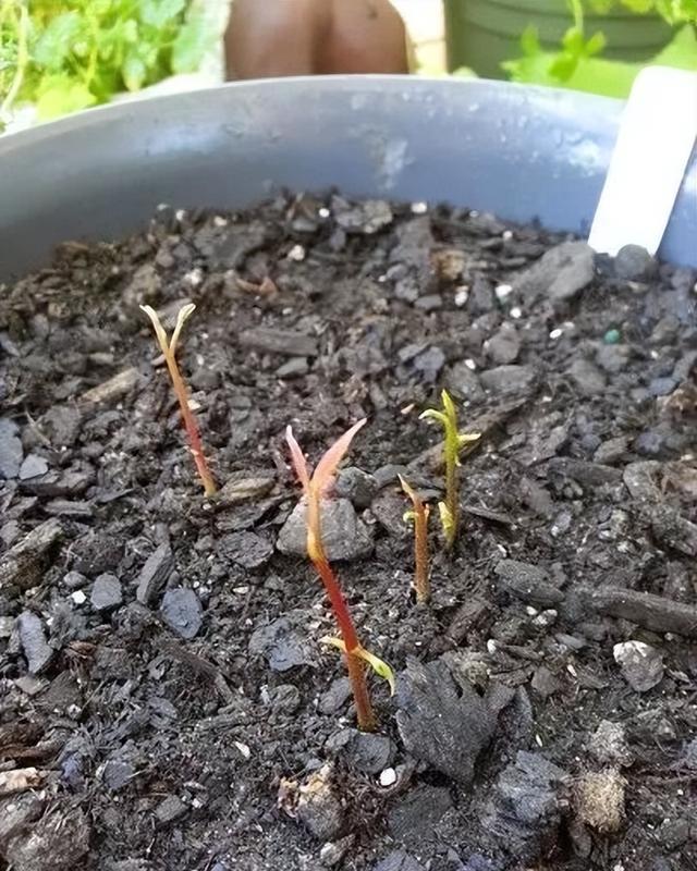 将花盆放在通风的背阴处,保持最低温度在12度以上,每天用喷壶喷一遍水,保持土壤湿润。大约1周左右,种子的嫩芽就会破土而出。荔枝新长出的嫩芽是红色或者粉红色的,非常可爱。