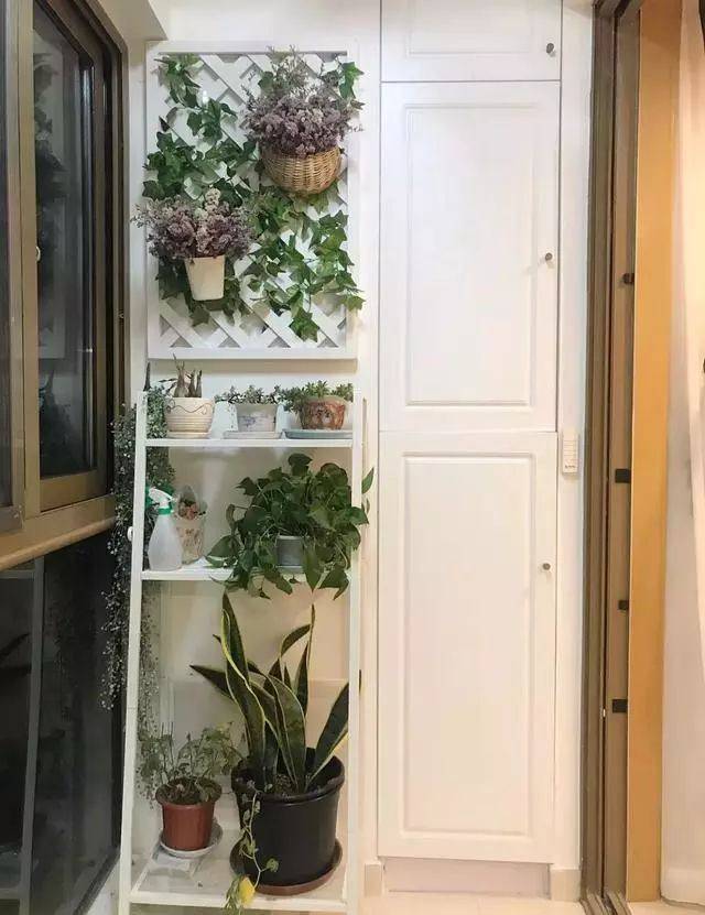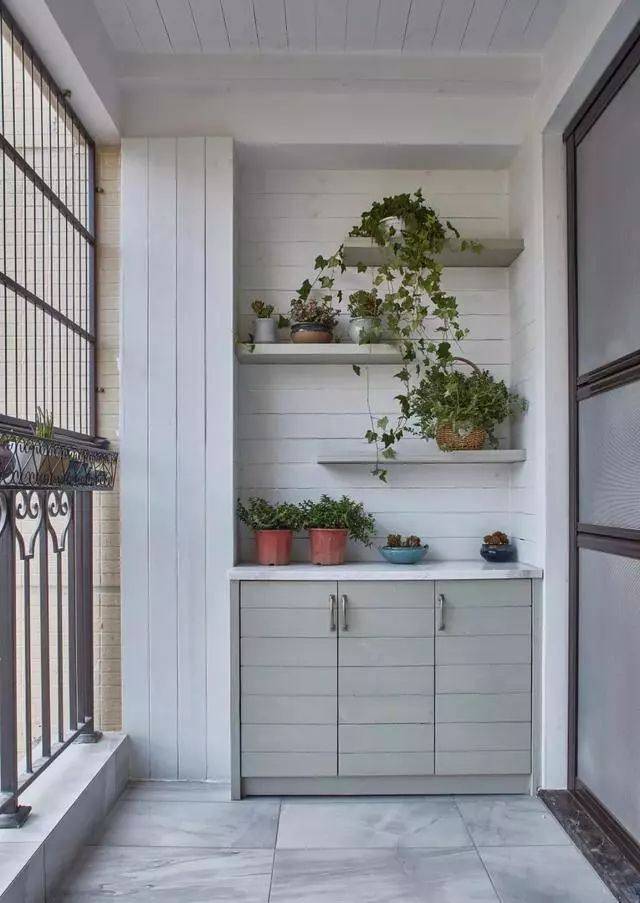 收纳是小户型们的一大难题,充分利用好每一处空间进行收纳,所以阳台也不能放过。我们可以把柜子和花架给结合在一起,这样既能收纳又能种花,岂不美哉。