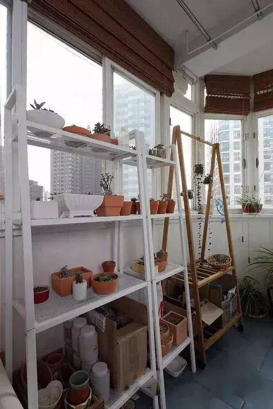 或者利用阳台和客厅之间隔断墙的部分来做柜子,固定的隔板摆放花盆也很方便,这样还可以提高整体的美观程度,还会有嵌入式的感觉。