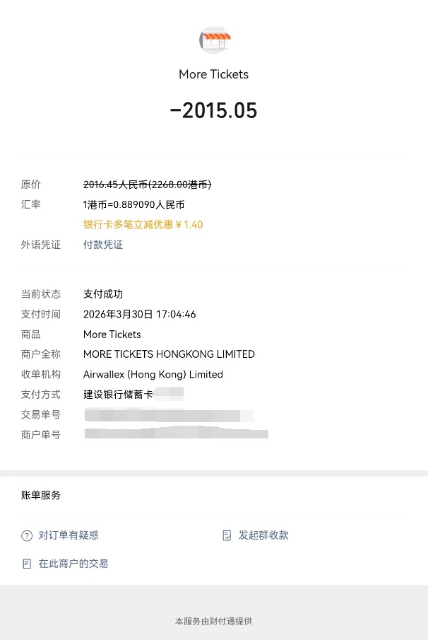 涉事“摩天轮”票务平台发来专项情况说明,解释该订单为中国港澳台地区非实名制购票,此类门票原本不支持退换。