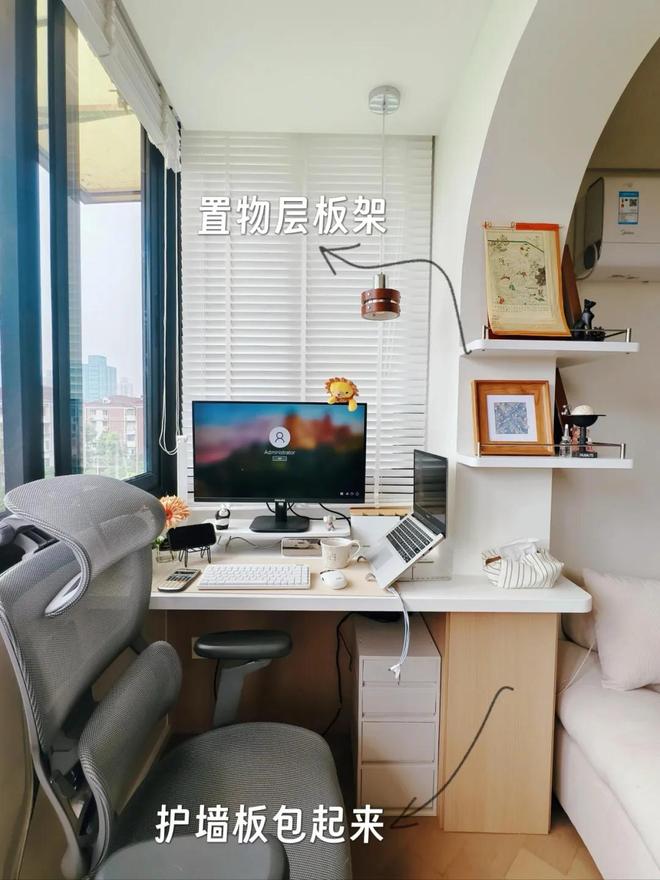 就是有一点要注意,因为是书桌的设计,在书桌以下的位置要做上同色的护墙板,防止踢来踢去把墙弄脏。