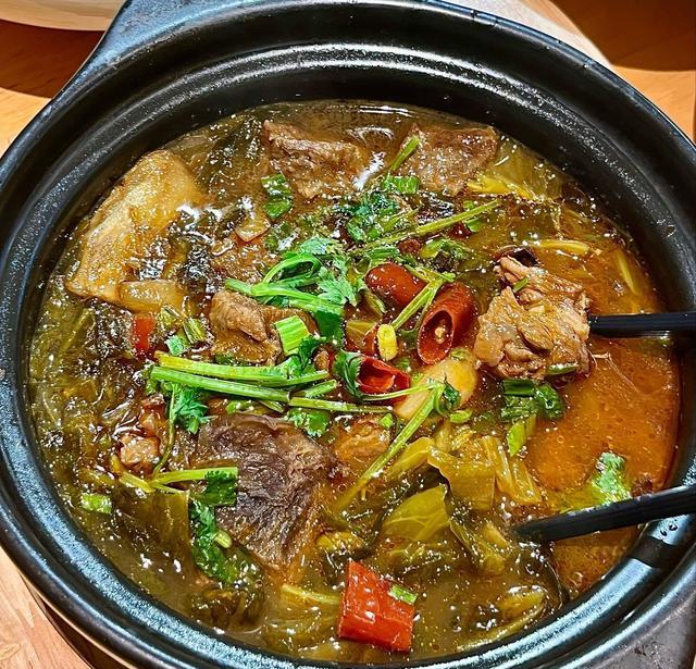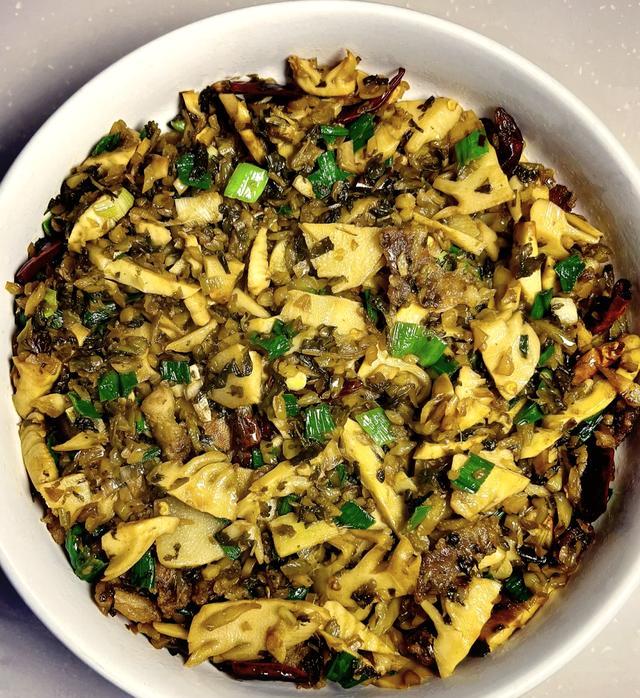 4. 倒入冬笋、酸菜多翻炒一会儿,喜欢入味一些的可盖盖焖一会儿,中间记得翻拌。