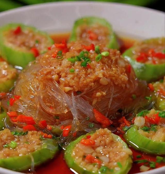 6、烧开蒸锅里的水,将装有丝瓜粉丝的盘子放入蒸锅,大火蒸5分钟,丝瓜变软入味后取出,撒上葱花即可上桌。