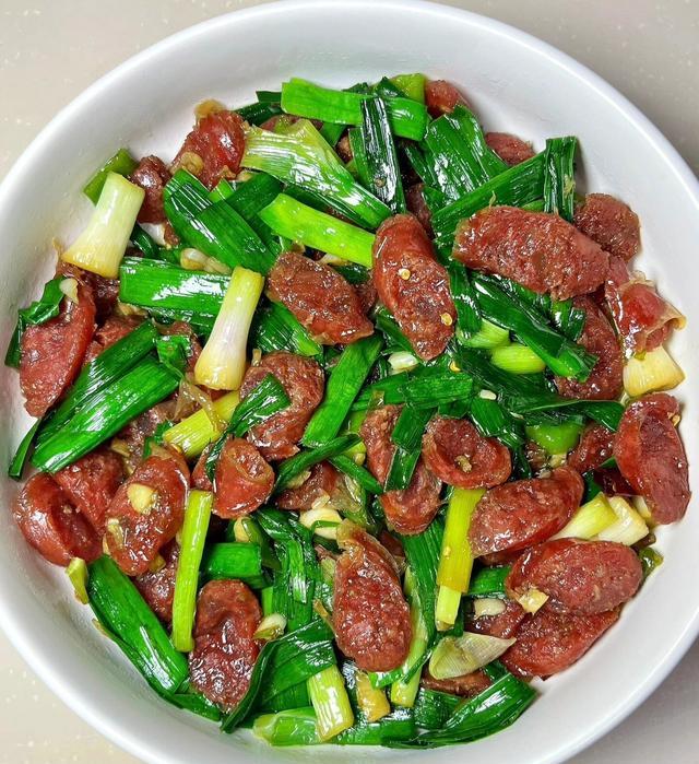 食材用量: 四川或广式腊肠2根(约150克),蒜苗1大把(约200克),干辣椒2个(可选),生姜2片,生抽1小勺(如果腊肠够咸就不加),糖小半勺。