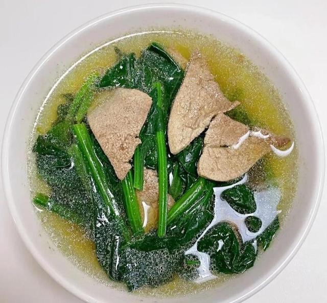 所需食材:新鲜猪肝200克、菠菜300克、姜丝适量、料酒1勺、淀粉1勺、盐适量、白胡椒粉少许、香油几滴、清水适量